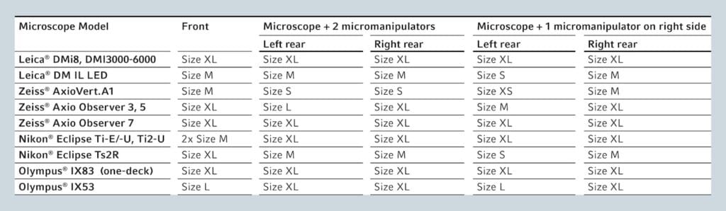 It is decisive to take into account the total weight of your microscope, including the mounted accessories, and the load distribution of the individual contact points.